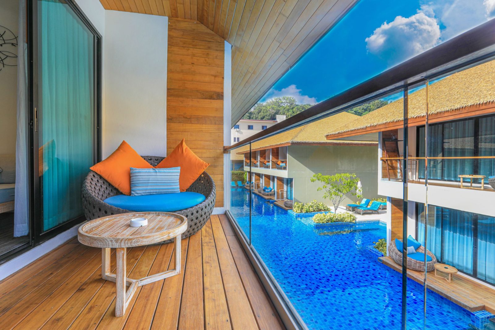 Deluxe Pool View Room with Pool View, room size 52 sq. m. spacious room and privacy; there is a balcony overlooking the pool behind the room.